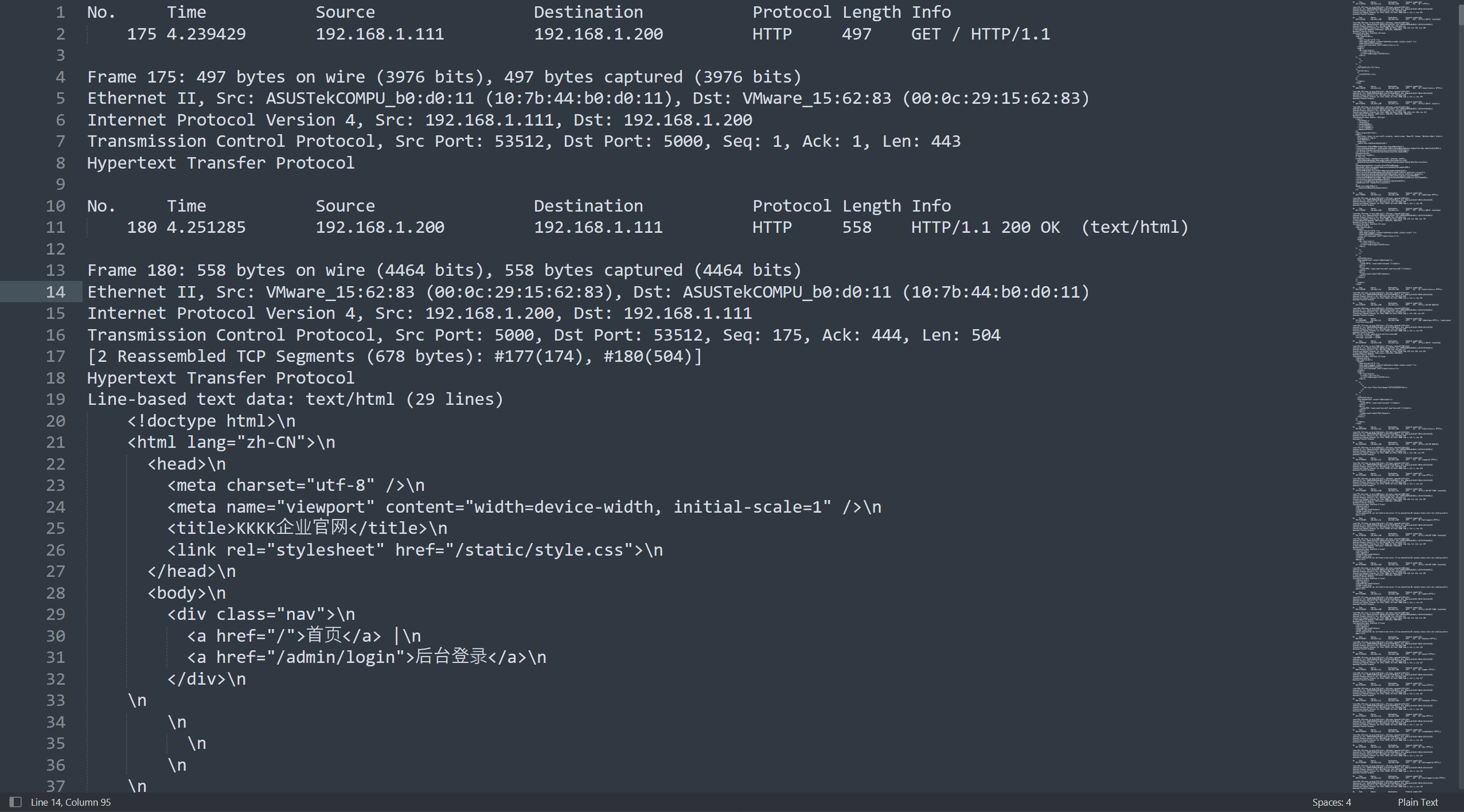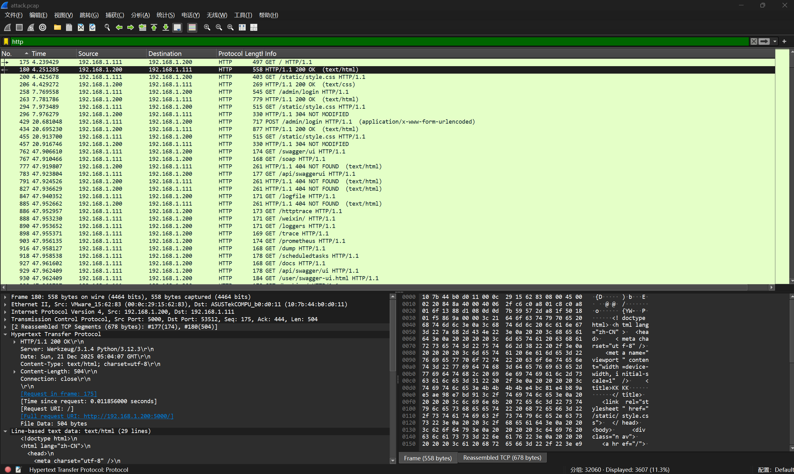 下载附件,wireshark打开,按照惯例,筛选一下http协议的流量包,大致浏览一下,是一个ip多次登录网站后台,但是密码一直不对,导出分组解析结果为纯文本看的更清晰