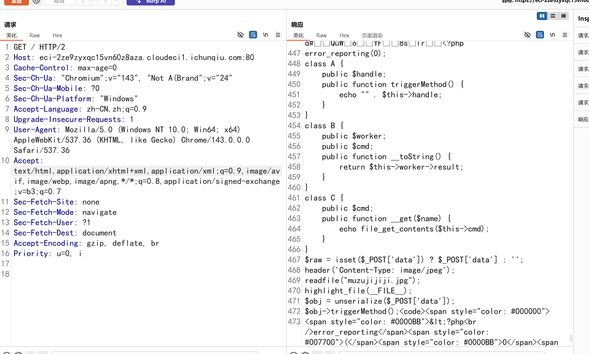 <span style="color: #0000BB"><?php<br />error_reporting</span><span style="color: #007700">(</span><span style="color: #0000BB">0</span><span style="color: #007700">);<br />class </span><span style="color: #0000BB">A </span><span style="color: #007700">{<br /> public </span><span style="color: #0000BB">$handle</span><span style="color: #007700">;<br /> public function </span><span style="color: #0000BB">triggerMethod</span><span style="color: #007700">() {<br /> echo </span><span style="color: #DD0000">"" </span><span style="color: #007700">. </span><span style="color: #0000BB">$this</span><span style="color: #007700">-></span><span style="color: #0000BB">handle</span><span style="color: #007700">; <br /> }<br />}<br />class </span><span style="color: #0000BB">B </span><span style="color: #007700">{<br /> public </span><span style="color: #0000BB">$worker</span><span style="color: #007700">;<br /> public </span><span style="color: #0000BB">$cmd</span><span style="color: #007700">;<br /> public function </span><span style="color: #0000BB">__toString</span><span style="color: #007700">() {<br /> return </span><span style="color: #0000BB">$this</span><span style="color: #007700">-></span><span style="color: #0000BB">worker</span><span style="color: #007700">-></span><span style="color: #0000BB">result</span><span style="color: #007700">;<br /> }<br />}<br />class </span><span style="color: #0000BB">C </span><span style="color: #007700">{<br /> public </span><span style="color: #0000BB">$cmd</span><span style="color: #007700">;<br /> public function </span><span style="color: #0000BB">__get</span><span style="color: #007700">(</span><span style="color: #0000BB">$name</span><span style="color: #007700">) {<br /> echo </span><span style="color: #0000BB">file_get_contents</span><span style="color: #007700">(</span><span style="color: #0000BB">$this</span><span style="color: #007700">-></span><span style="color: #0000BB">cmd</span><span style="color: #007700">);<br /> }<br />}<br /></span><span style="color: #0000BB">$raw </span><span style="color: #007700">= isset(</span><span style="color: #0000BB">$_POST</span><span style="color: #007700">[</span><span style="color: #DD0000">'data'</span><span style="color: #007700">]) ? </span><span style="color: #0000BB">$_POST</span><span style="color: #007700">[</span><span style="color: #DD0000">'data'</span><span style="color: #007700">] : </span><span style="color: #DD0000">''</span><span style="color: #007700">;<br /></span><span style="color: #0000BB">header</span><span style="color: #007700">(</span><span style="color: #DD0000">'Content-Type: image/jpeg'</span><span style="color: #007700">);<br /></span><span style="color: #0000BB">readfile</span><span style="color: #007700">(</span><span style="color: #DD0000">"muzujijiji.jpg"</span><span style="color: #007700">);<br /></span><span style="color: #0000BB">highlight_file</span><span style="color: #007700">(</span><span style="color: #0000BB">__FILE__</span><span style="color: #007700">);<br /></span><span style="color: #0000BB">$obj </span><span style="color: #007700">= </span><span style="color: #0000BB">unserialize</span><span style="color: #007700">(</span><span style="color: #0000BB">$_POST</span><span style="color: #007700">[</span><span style="color: #DD0000">'data'</span><span style="color: #007700">]);<br /></span><span style="color: #0000BB">$obj</span><span style="color: #007700">-></span><span style="color: #0000BB">triggerMethod</span><span style="color: #007700">();</span>